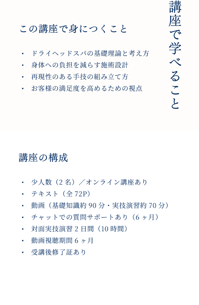 受講開始に発行する専用IDとパスワードにて受講生専用サイトにログインしていただき学習を進めます。受講期間中は動画を何度でもご視聴できます。また、教本テキストもお渡しします。 動画とテキストがリンクした内容になっているため、実技演習前の予習や振り返りとして学習していただけます。
